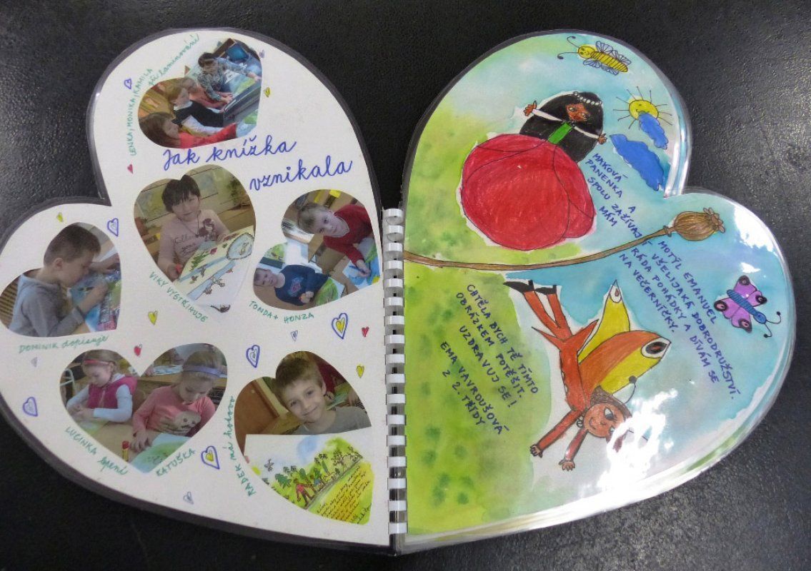 Na podzim jsme ve výtvarném kroužku tvořili do soutěže Srdce s láskou darované již třetí srdce. Děti pracovaly jako v předešlých letech tvořivě, svědomitě, ale řekla bych, že s větším nasazením a zodpovědností. Každý chtěl mít svou stránku nejpěknější. Vždyť vyráběly srdce pro Ríšu, který před rokem tvořil s nimi. Proto musela být srdcová knížka super! A to mě dostalo. Víte, já si k těm dětem chodím ‚dobít baterky‘. Čistota dětských srdíček, radost z tvoření, jásavá radost z výhry, to je balzám pro každou kantorskou duši, to je moje největší odměna. Říká se, že zlo plodí zlo, dobro plodí dobro. Kdo zasévá radost, sklízí radost.